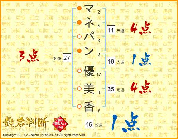 マ(2画)ネ(4画)パ(3画)ン(2画) 優(17画)美(9画)香(9画)