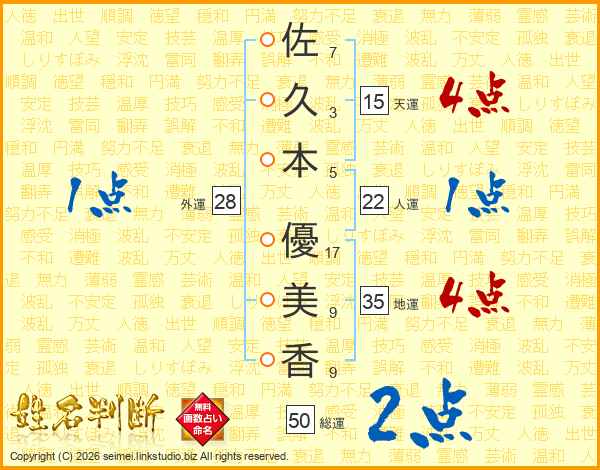 佐(7画)久(3画)本(5画) 優(17画)美(9画)香(9画)