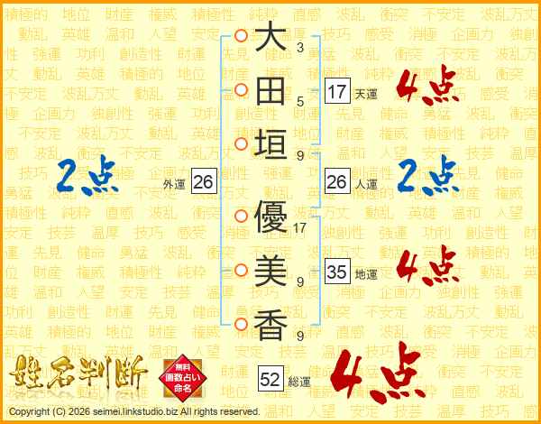 大(3画)田(5画)垣(9画) 優(17画)美(9画)香(9画)