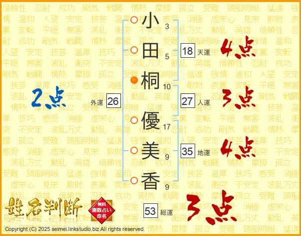 小(3画)田(5画)桐(10画) 優(17画)美(9画)香(9画)