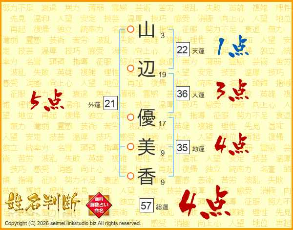 山(3画)辺(19画) 優(17画)美(9画)香(9画)