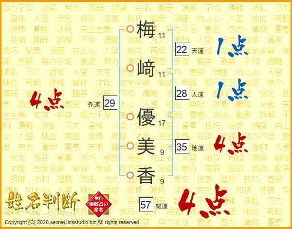 梅(11画)﨑(11画) 優(17画)美(9画)香(9画)
