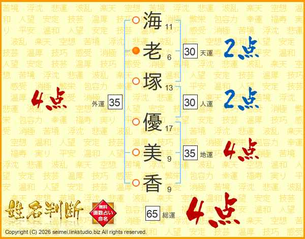 海(11画)老(6画)塚(13画) 優(17画)美(9画)香(9画)