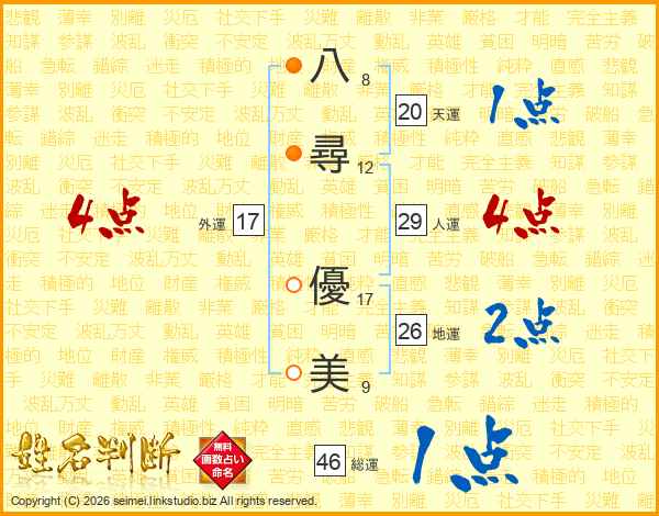 画数の奇数(○陽)と偶数(●陰)の配列で吉凶を占います。どちらかにかたよる名前は大凶名で避ける必要があります。画数の奇数偶数。