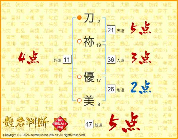 刀(2画)祢(19画) 優(17画)美(9画)