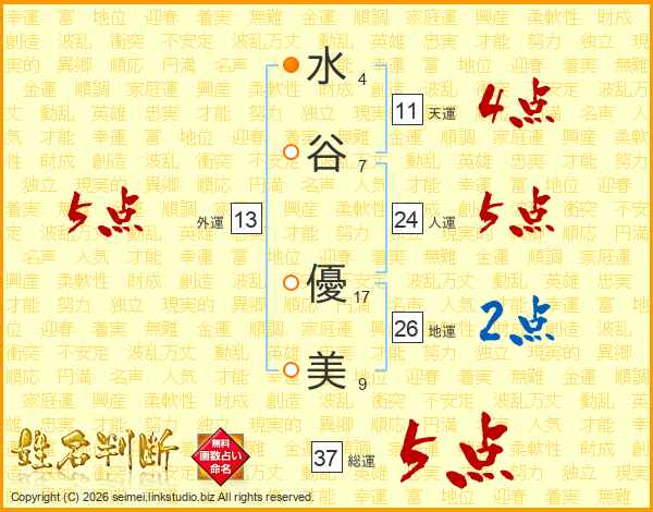 水(4画)谷(7画) 優(17画)美(9画)