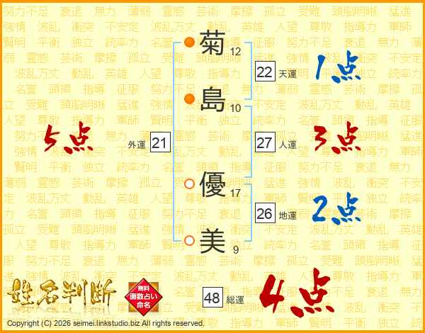 あなたの人生を表す1番重要な運勢です。生涯を通じて影響する総合運となり、主に50歳以降の晩年期に影響を及ぼします。苗字と名前の合計画数。