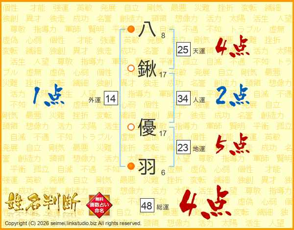 八(8画)鍬(17画) 優(17画)羽(6画)
