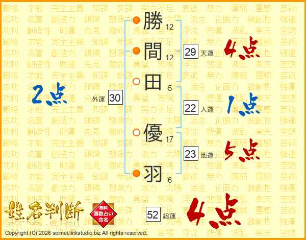 勝(12画)間(12画)田(5画) 優(17画)羽(6画)