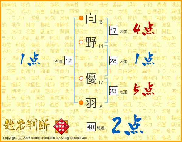 生活面を象徴する運勢です。外部から受ける影響力を表し、結婚運、家庭運や職場、環境への順応性を表します。総運から人運を引いた画数。姓や名が1文字の場合を除く。