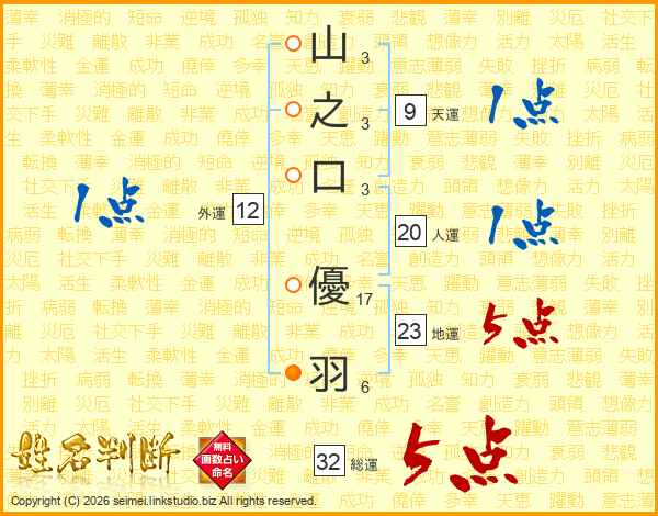 山(3画)之(3画)口(3画) 優(17画)羽(6画)