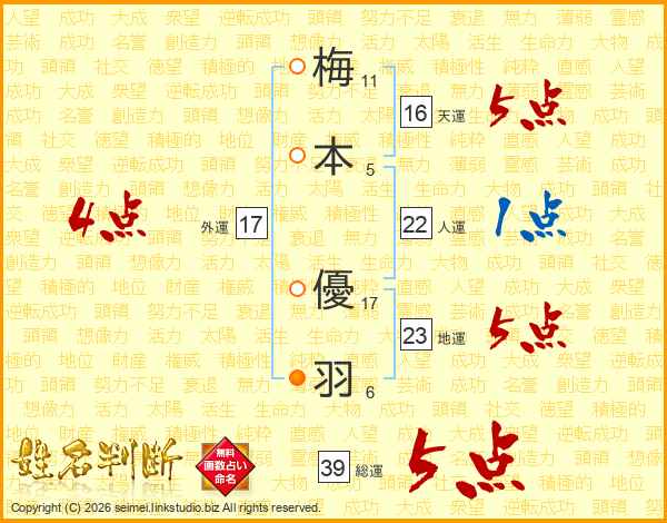 あなたの人生を表す1番重要な運勢です。生涯を通じて影響する総合運となり、主に50歳以降の晩年期に影響を及ぼします。苗字と名前の合計画数。
