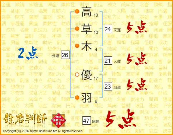 高(10画)草(10画)木(4画) 優(17画)羽(6画)