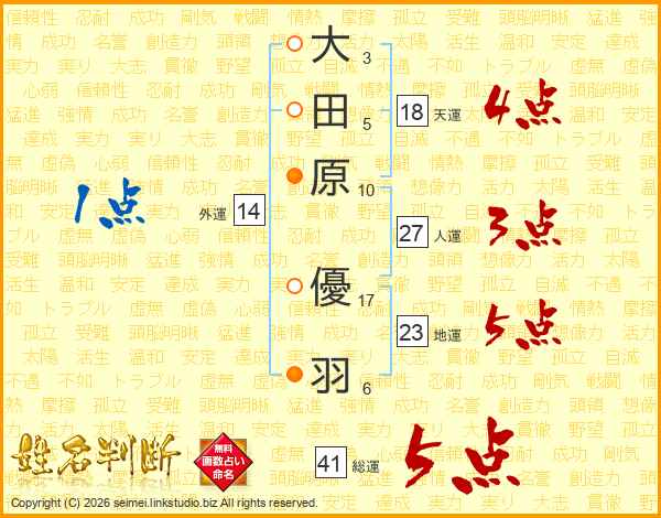 大(3画)田(5画)原(10画) 優(17画)羽(6画)