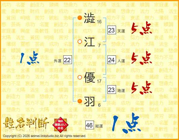 画数の奇数(○陽)と偶数(●陰)の配列で吉凶を占います。どちらかにかたよる名前は大凶名で避ける必要があります。画数の奇数偶数。