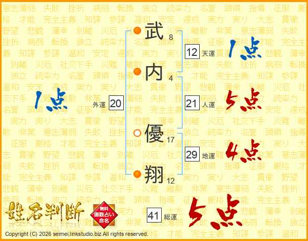 武内優翔さんの総運は41画の5点!