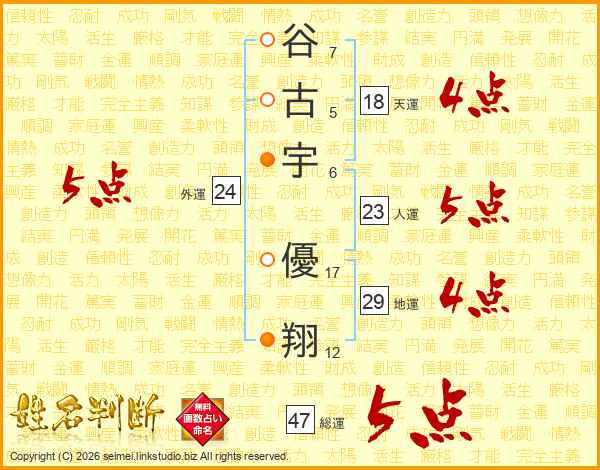 谷(7画)古(5画)宇(6画) 優(17画)翔(12画)