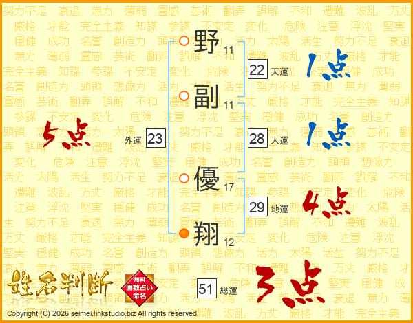 野(11画)副(11画) 優(17画)翔(12画)