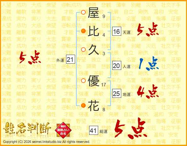 屋(9画)比(4画)久(3画) 優(17画)花(8画)