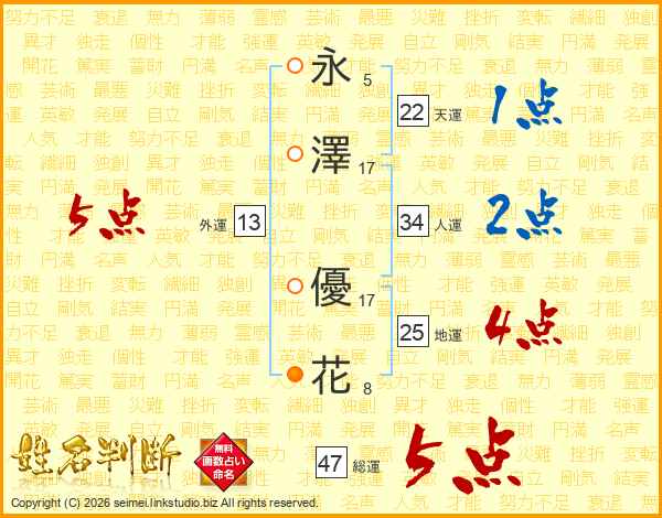 永(5画)澤(17画) 優(17画)花(8画)