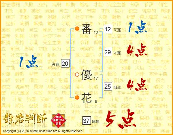 生活面を象徴する運勢です。外部から受ける影響力を表し、結婚運、家庭運や職場、環境への順応性を表します。総運から人運を引いた画数。姓や名が1文字の場合を除く。