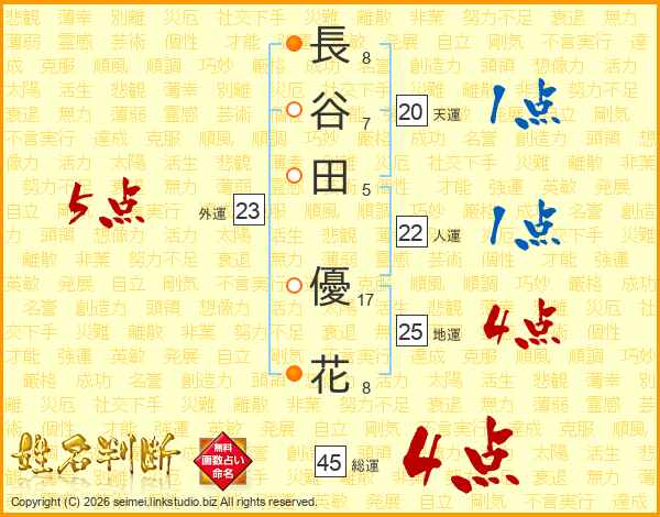 長(8画)谷(7画)田(5画) 優(17画)花(8画)