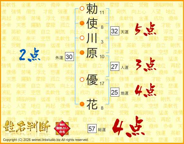 勅(11画)使(8画)川(3画)原(10画) 優(17画)花(8画)