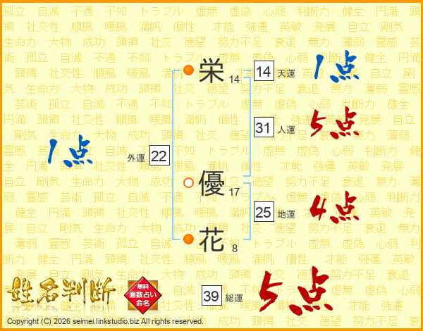 生活面を象徴する運勢です。外部から受ける影響力を表し、結婚運、家庭運や職場、環境への順応性を表します。総運から人運を引いた画数。姓や名が1文字の場合を除く。