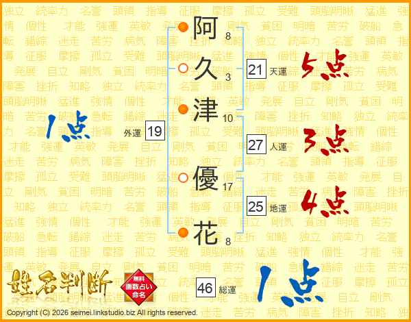 阿(8画)久(3画)津(10画) 優(17画)花(8画)