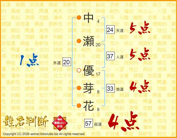 中(4画)瀬(20画) 優(17画)芽(8画)花(8画)