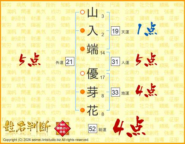 山(3画)入(2画)端(14画) 優(17画)芽(8画)花(8画)