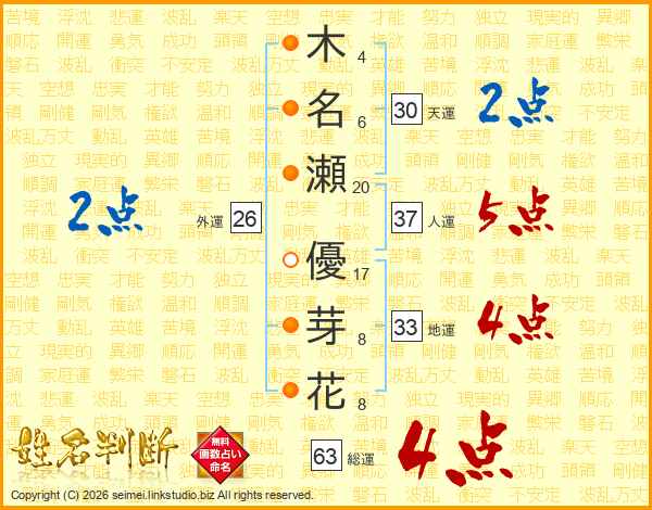 木(4画)名(6画)瀬(20画) 優(17画)芽(8画)花(8画)
