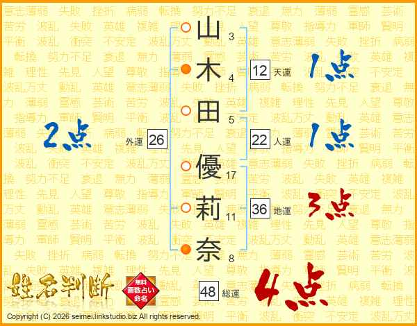 山(3画)木(4画)田(5画) 優(17画)莉(11画)奈(8画)