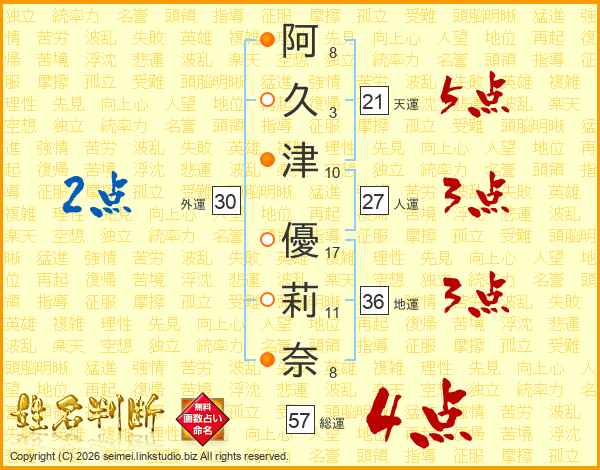 阿(8画)久(3画)津(10画) 優(17画)莉(11画)奈(8画)