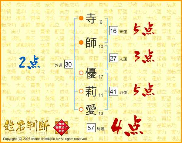 寺(6画)師(10画) 優(17画)莉(11画)愛(13画)