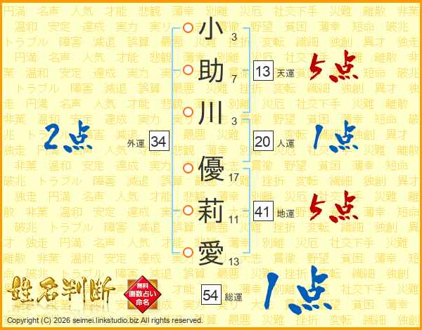小(3画)助(7画)川(3画) 優(17画)莉(11画)愛(13画)
