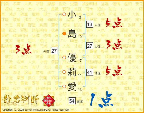 小(3画)島(10画) 優(17画)莉(11画)愛(13画)
