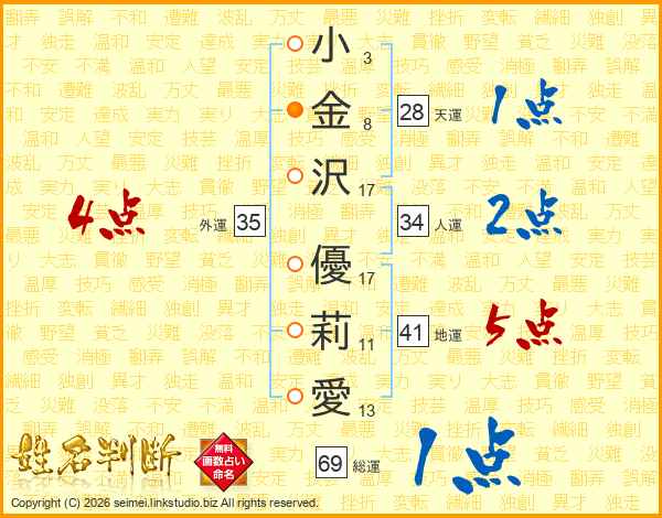 小(3画)金(8画)沢(17画) 優(17画)莉(11画)愛(13画)