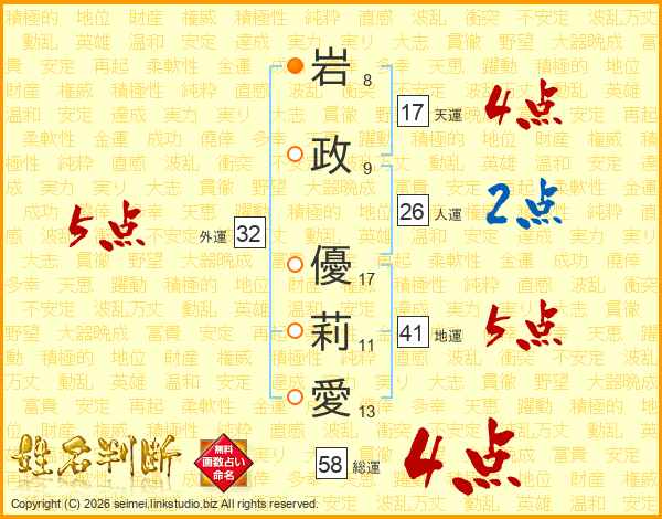 岩(8画)政(9画) 優(17画)莉(11画)愛(13画)
