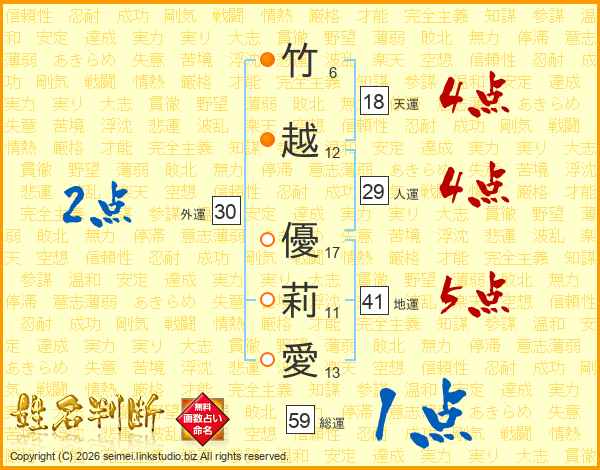 竹(6画)越(12画) 優(17画)莉(11画)愛(13画)