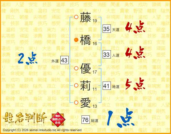 藤(19画)橋(16画) 優(17画)莉(11画)愛(13画)