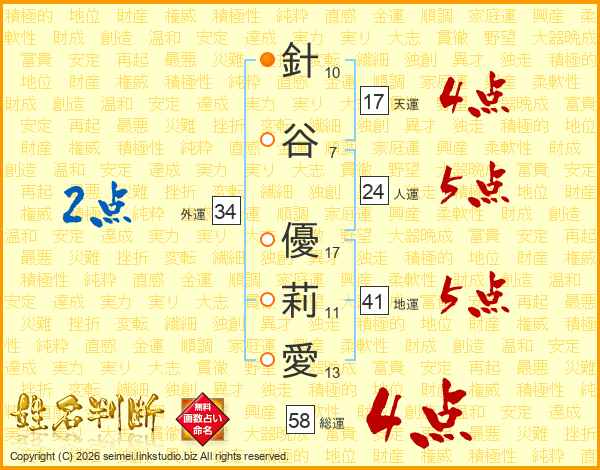 針谷優莉愛さんの総運は58画の4点!