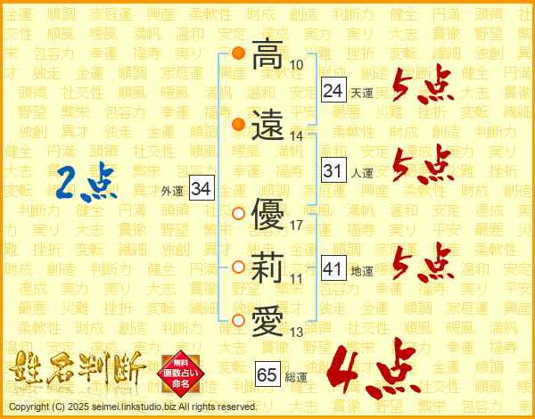 高(10画)遠(14画) 優(17画)莉(11画)愛(13画)