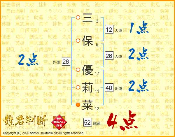 三(3画)保(9画) 優(17画)莉(11画)菜(12画)