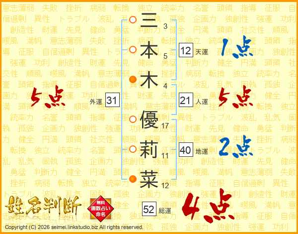 三(3画)本(5画)木(4画) 優(17画)莉(11画)菜(12画)