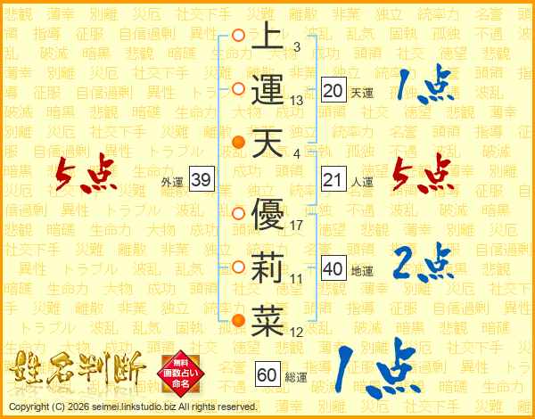 上(3画)運(13画)天(4画) 優(17画)莉(11画)菜(12画)