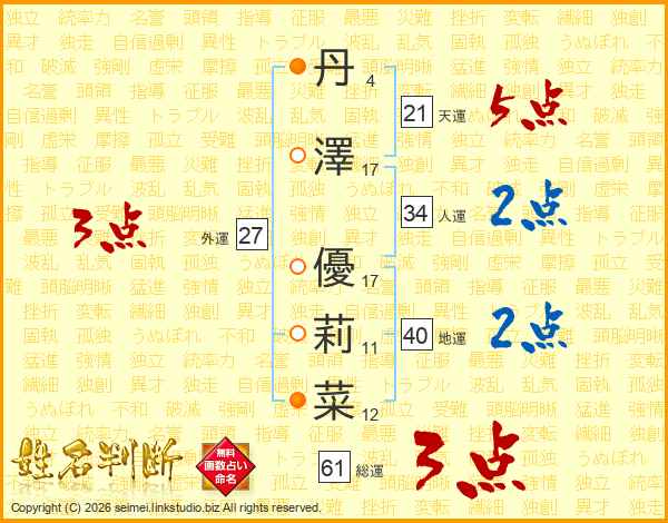 丹(4画)澤(17画) 優(17画)莉(11画)菜(12画)