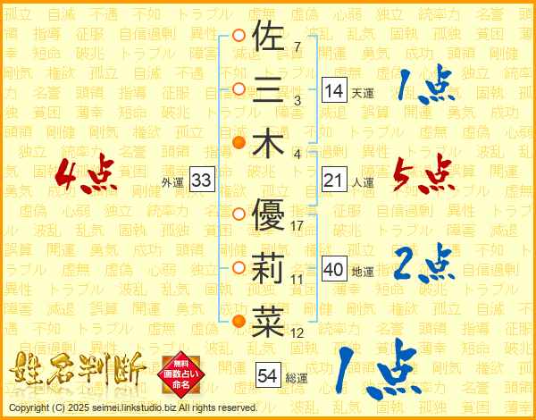 佐(7画)三(3画)木(4画) 優(17画)莉(11画)菜(12画)