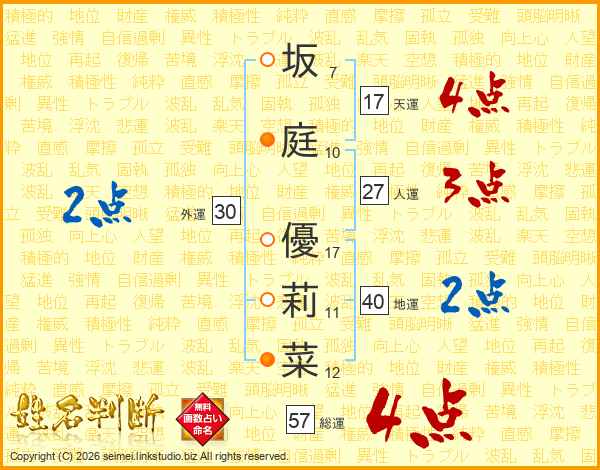 坂庭優莉菜さんの総運は57画の4点!
