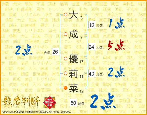 大(3画)成(7画) 優(17画)莉(11画)菜(12画)